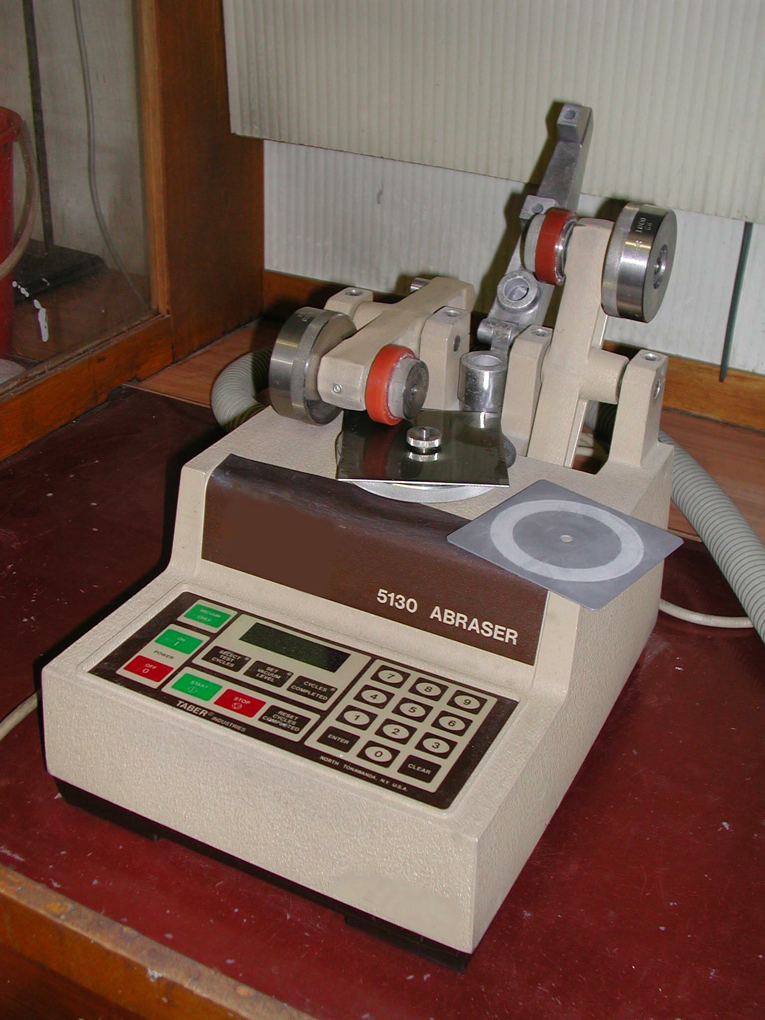 Při hodnocení vlastností laků na parkety se kromě standardních zkoušek (zasychání, tvrdost, mechanické vlastnosti) užívá i speciální metodika, se kterou vás chceme seznámit. Jedná se o odolnost při oděru brusným papírem, kterou možná znáte ji pod názvem odolnost obrusu, otěruvzdornost nebo počet cyklů. U podlahářských materiálů bývá uváděna velmi často. Samotné hodnocení se provádí v přístroji Taber-Abraser (viz obrázek). Vzorek je nanesen na podkladu, který se v přístroji otáčí pod zatíženými rameny s kotoučem oblepeným brusným papírem. Výsledkem zkoušky je buď hmotnost obroušeného materiálu po absolvování určitého počtu otáček (cyklů), nebo počet cyklů, které nátěr přestál bez definovaného poškození (prodření na podklad apod.). Náročnější zkouška se provádí se zatížením 1 kg, u méně odolných materiálů se volí zatížení 500 g.