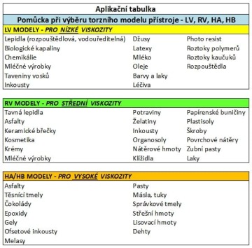 HA a HB lišících se měřícím rozsahem viskozity a pro každou torzní řadu uvádí příklady typických měřených materiálů.