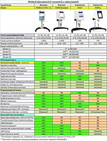 Tabulka s přehledem laboratorních reometrů a viskozimetrů uvádí základní parametry a funkce standardní řady přístrojů, a to digitálních modelů DVPlus, DV2T a DVNext. Historicky nejstarší analogový model viskozimetru (LVT, RVT, HAT, HBT) v tabulce uveden není, ale výrobce jej stále ještě nabízí.