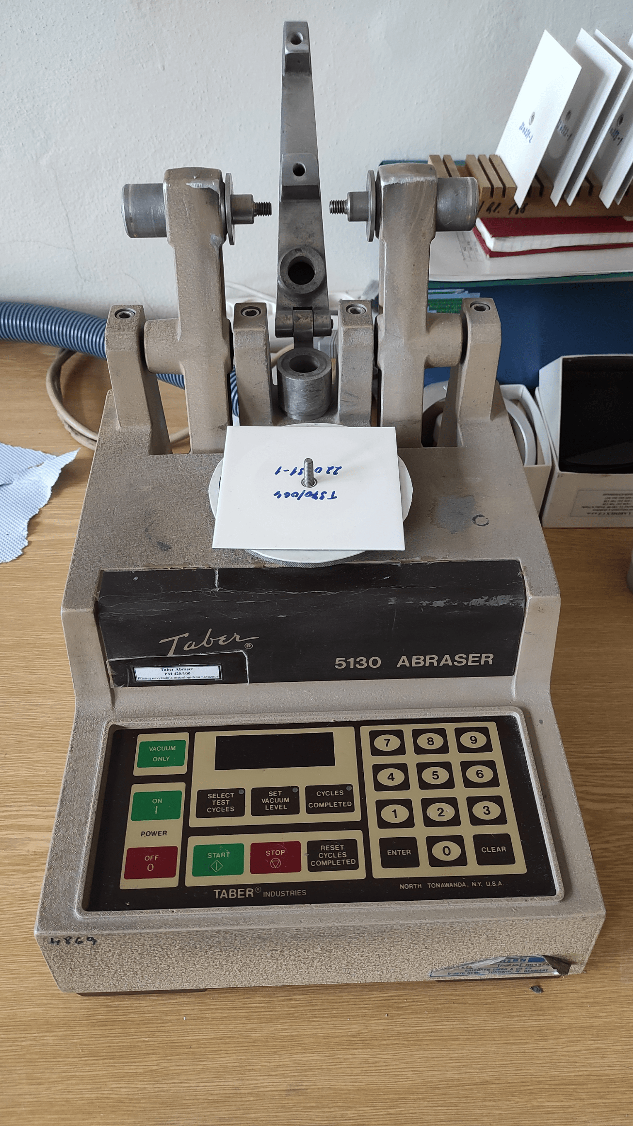 - ČSN EN ISO 5470-1, 7784-1, 2 – Odolnost v oděru (Taberův přístroj),
